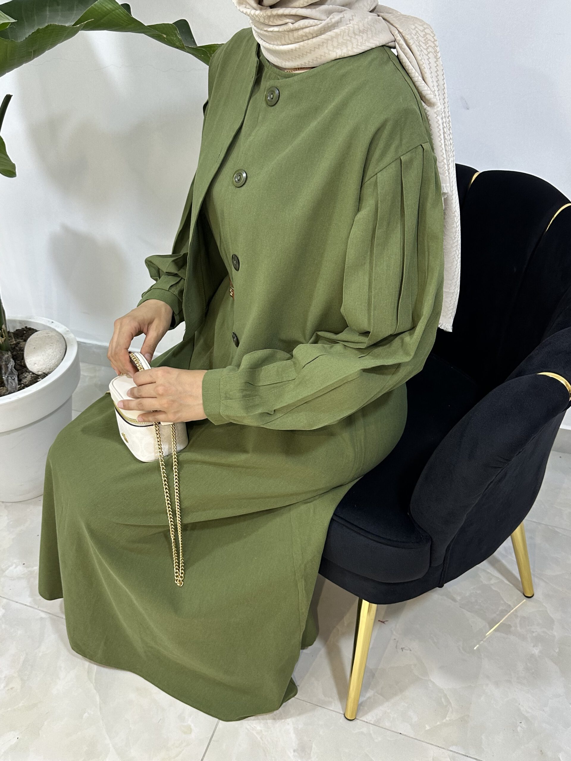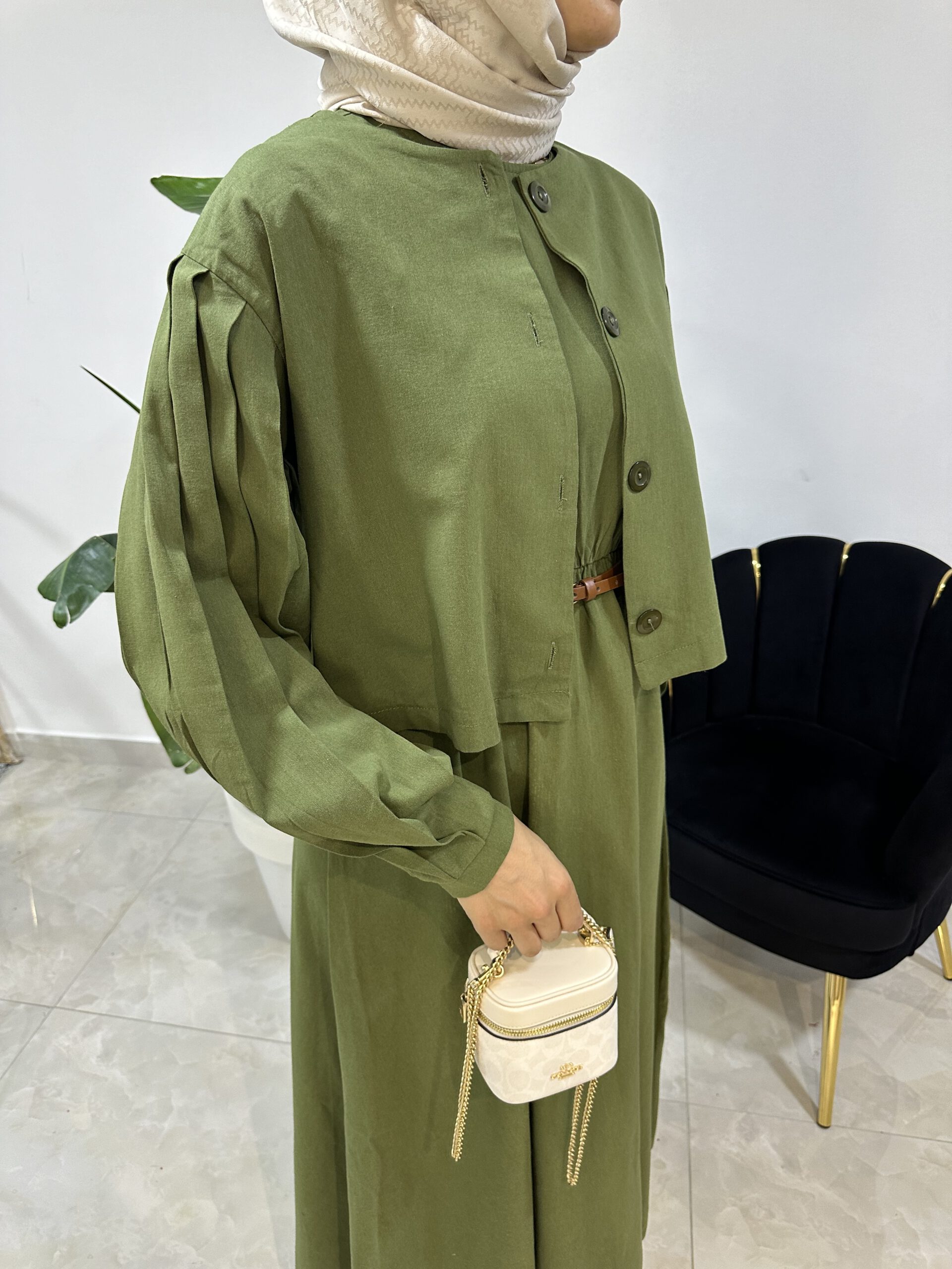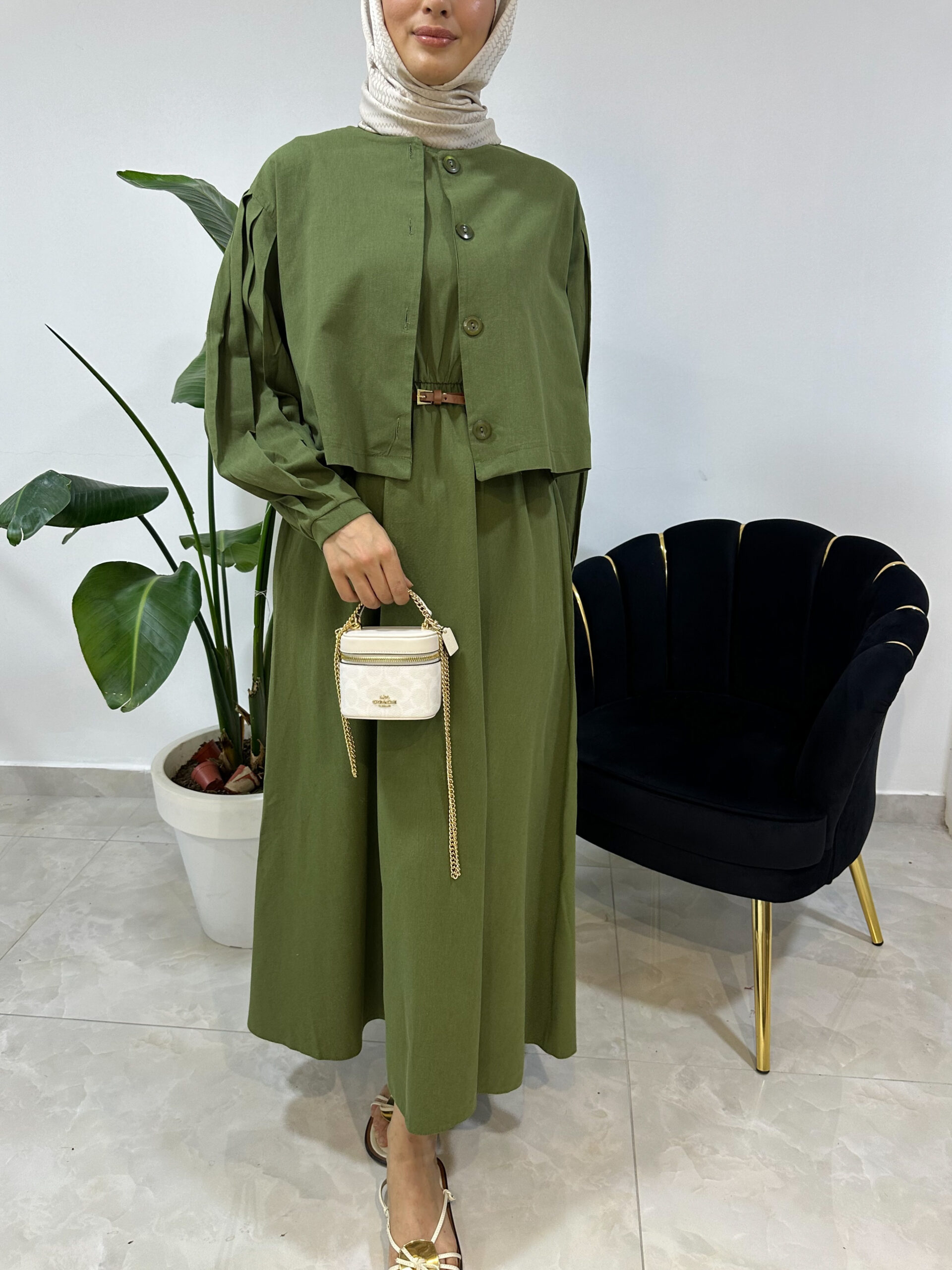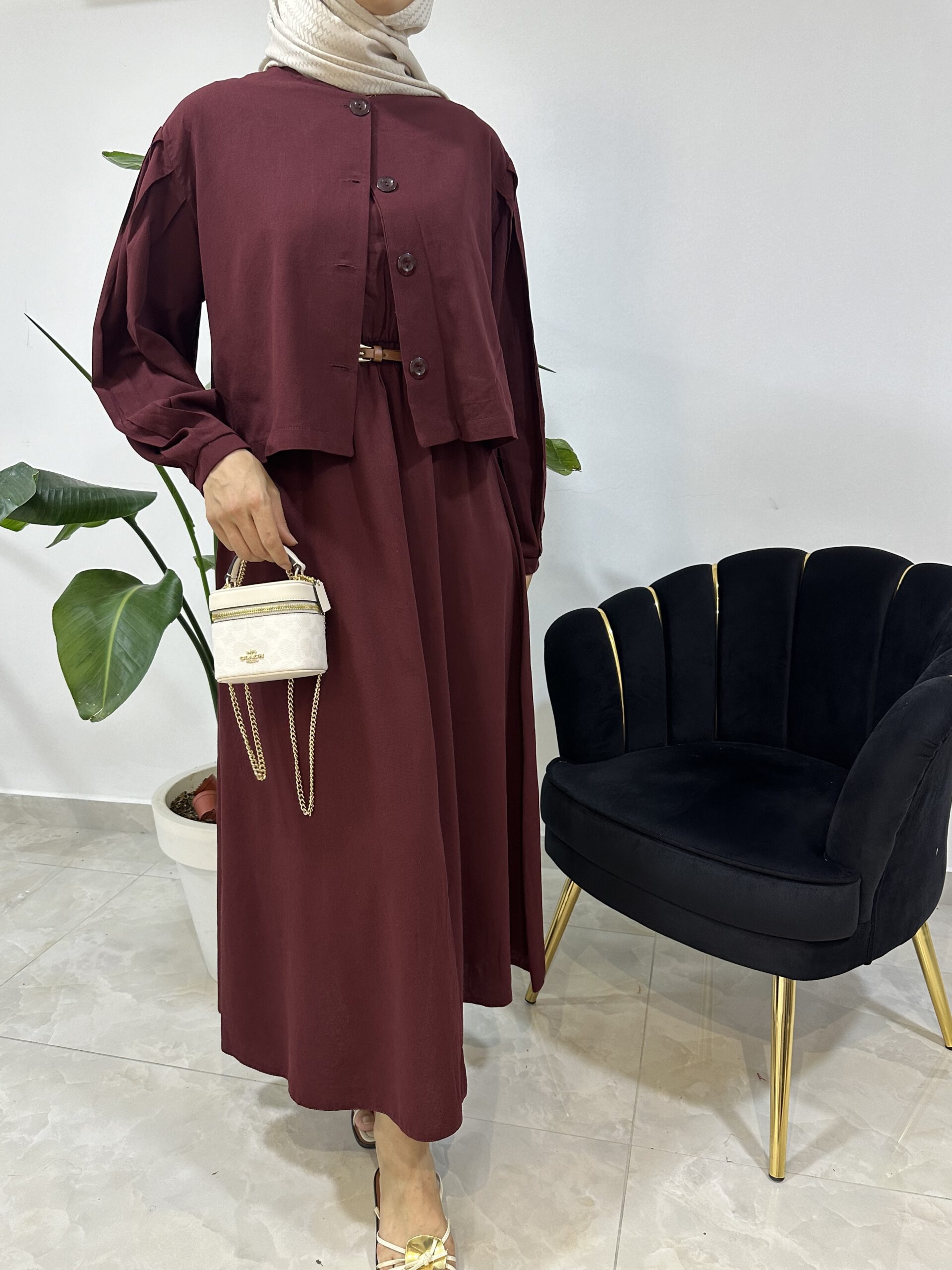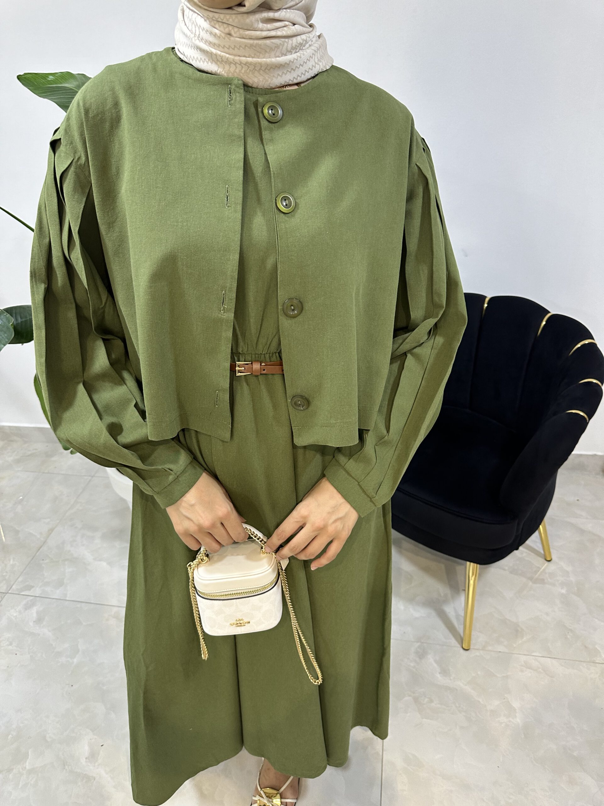 Das Kleid besticht durch seinen klassischen Schnitt, während die Jacke das Outfit harmonisch abrundet und zusätzliche Vielseitigkeit bietet. Zusammen entsteht ein Look, der sowohl feminin als auch modern wirkt.